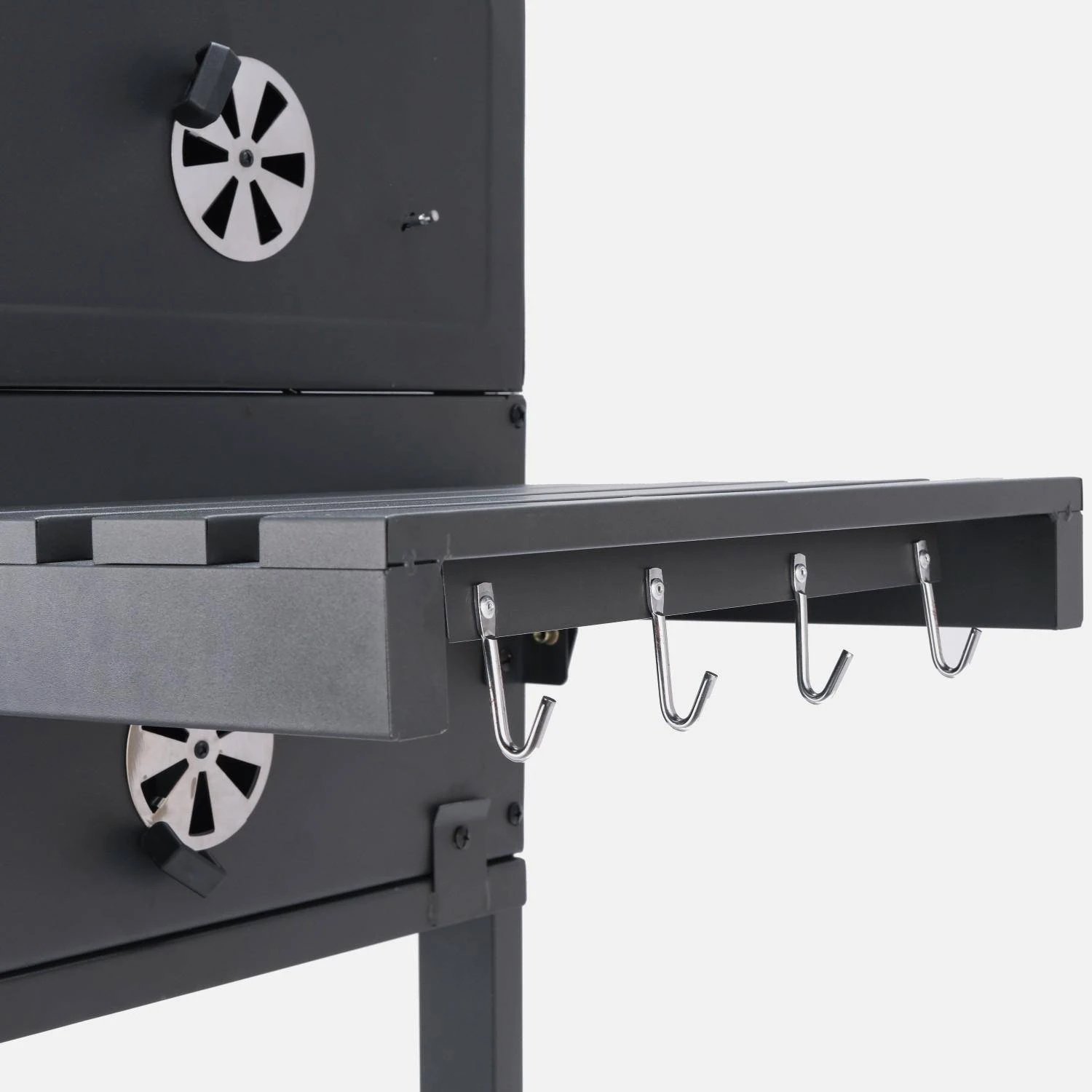 Bien pensé, il dispose d’une ouverture en façade pour charger le charbon. Il possède également 2 tablettes latérales en acier pour poser les plats et les accessoires. Ces dernières sont rabattables pour faciliter le rangement. Elles sont équipées de 4 crochets pour accrocher vos ustensiles et torchons. Le barbecue à charbon de bois Bernard est aussi muni d’un décapsuleur intégré, d’une étagère inférieure et de 2 poignées en inox pour manipuler le couvercle et récupérateur de cendres amovible. Ses 2 roues permettent de le déplacer facilement.