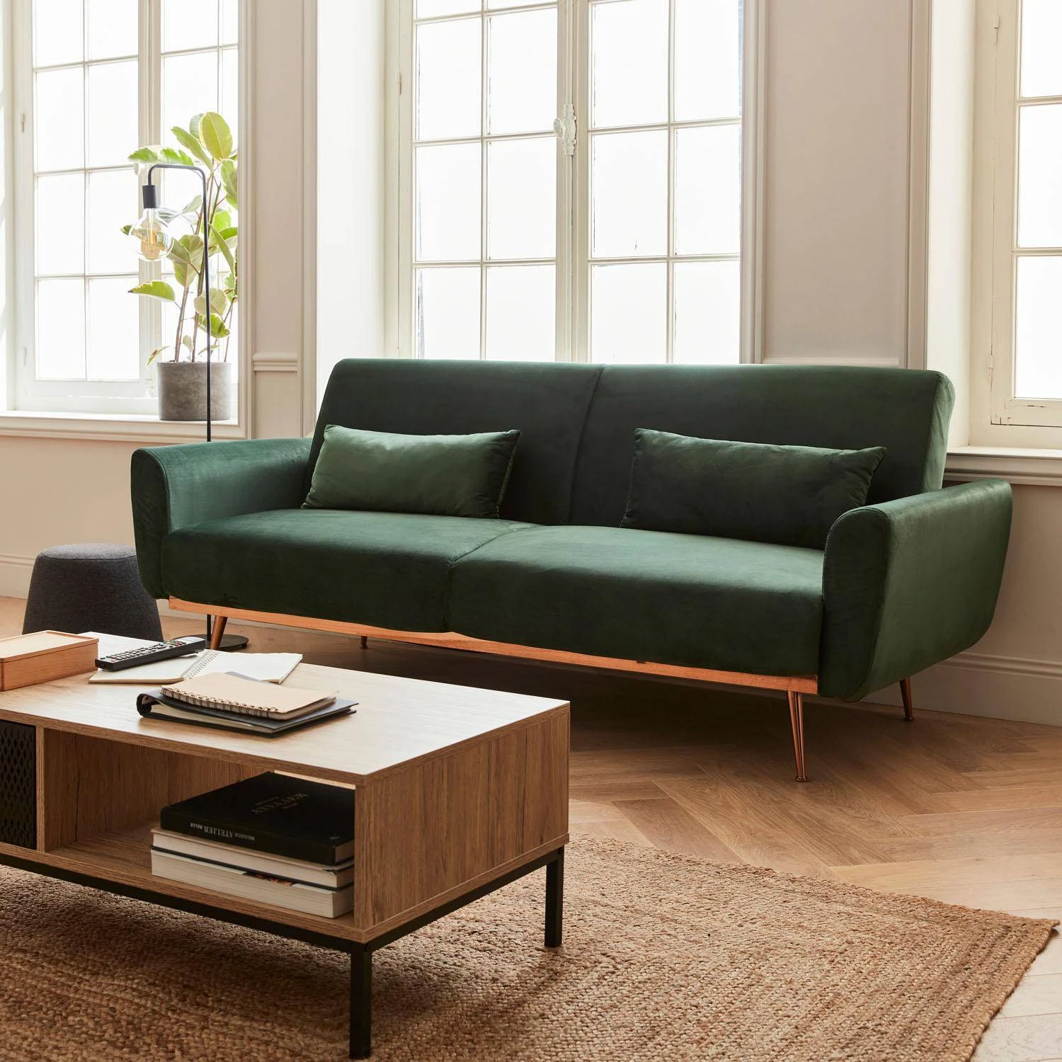 De belles formes pour ce canapé OSKAR, au velours doux et au piètement métallique oblique minimaliste. Vous serez également séduit par son système instantané d’inclinaison de dossier en 3 positions; canapé, dossier incliné ou encore position lit, à plat. L’assise et le dossier sont confectionnés avec une mousse dense et un système de soutien par ressorts et sangles élastiques, de quoi rendre l’ensemble très confortable tout en garantissant une assise ferme.