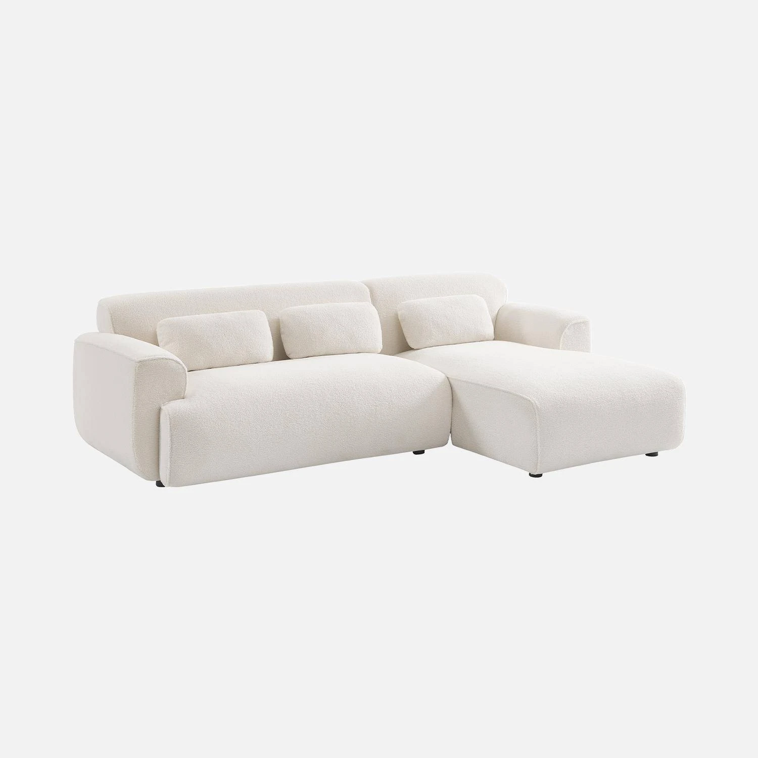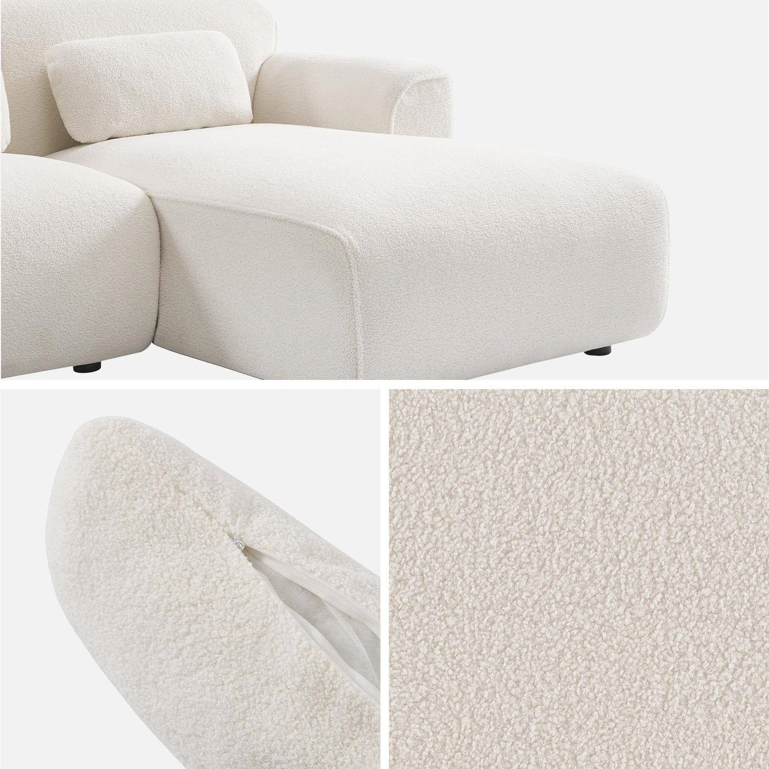 Ce canapé ne manquera pas d’ajouter une touche originale à une décoration trop classique grâce à son délicat revêtement en bouclette blanche. Son apparence à la fois chic et raffinée reste simple mais singulière. Grâce à son assise profonde et son angle qui permet une position allongée, ce canapé vous accompagnera dans vos moments de détente le week-end ou après une longue journée de travail. Fourni avec 3 petits coussins rectangulaires déhoussables pour plus de confort, vous pourrez sans problème vous relaxer avec un plaid tout doux et une tasse de café. Offrez-vous un salon minimaliste et réconfortant grâce à son tissu bouclettes délicat et à ses lignes raffinées !