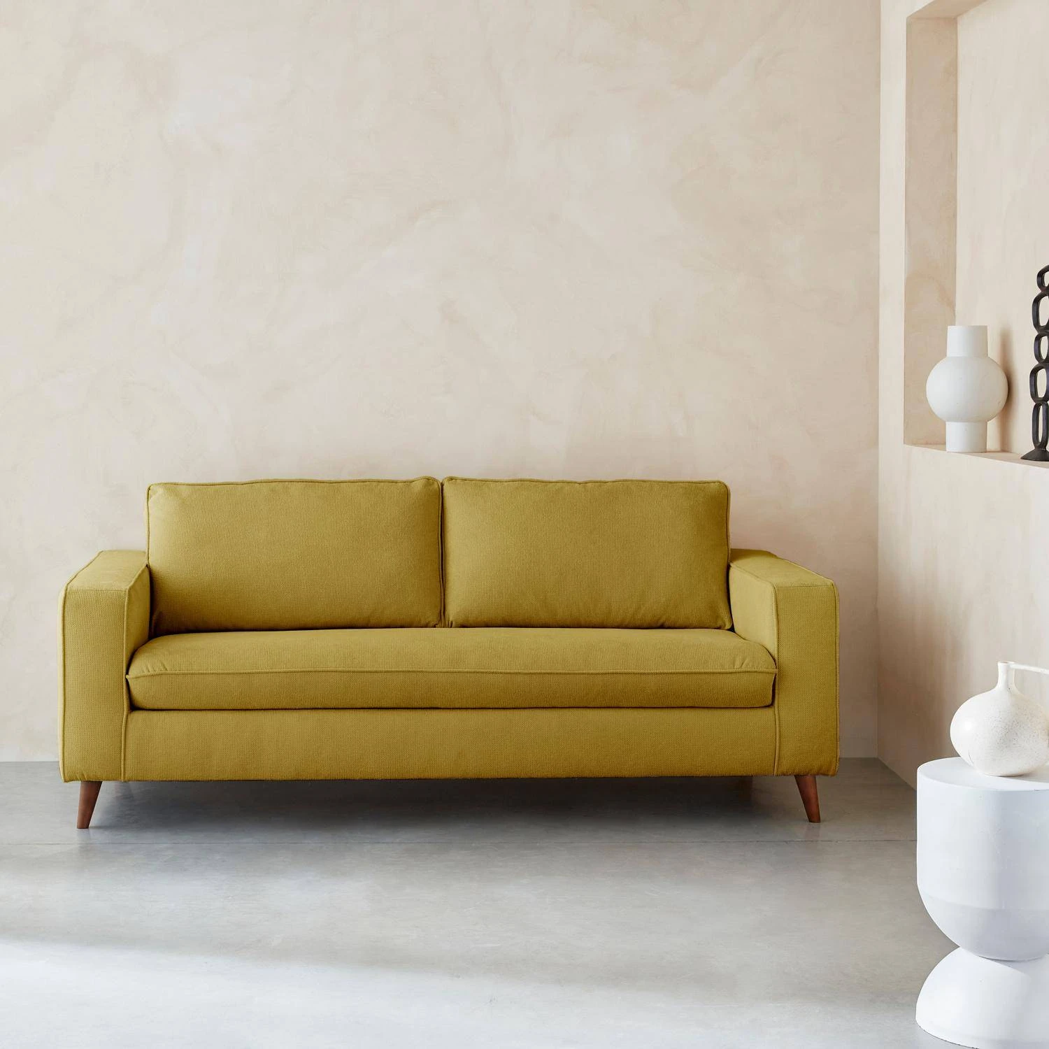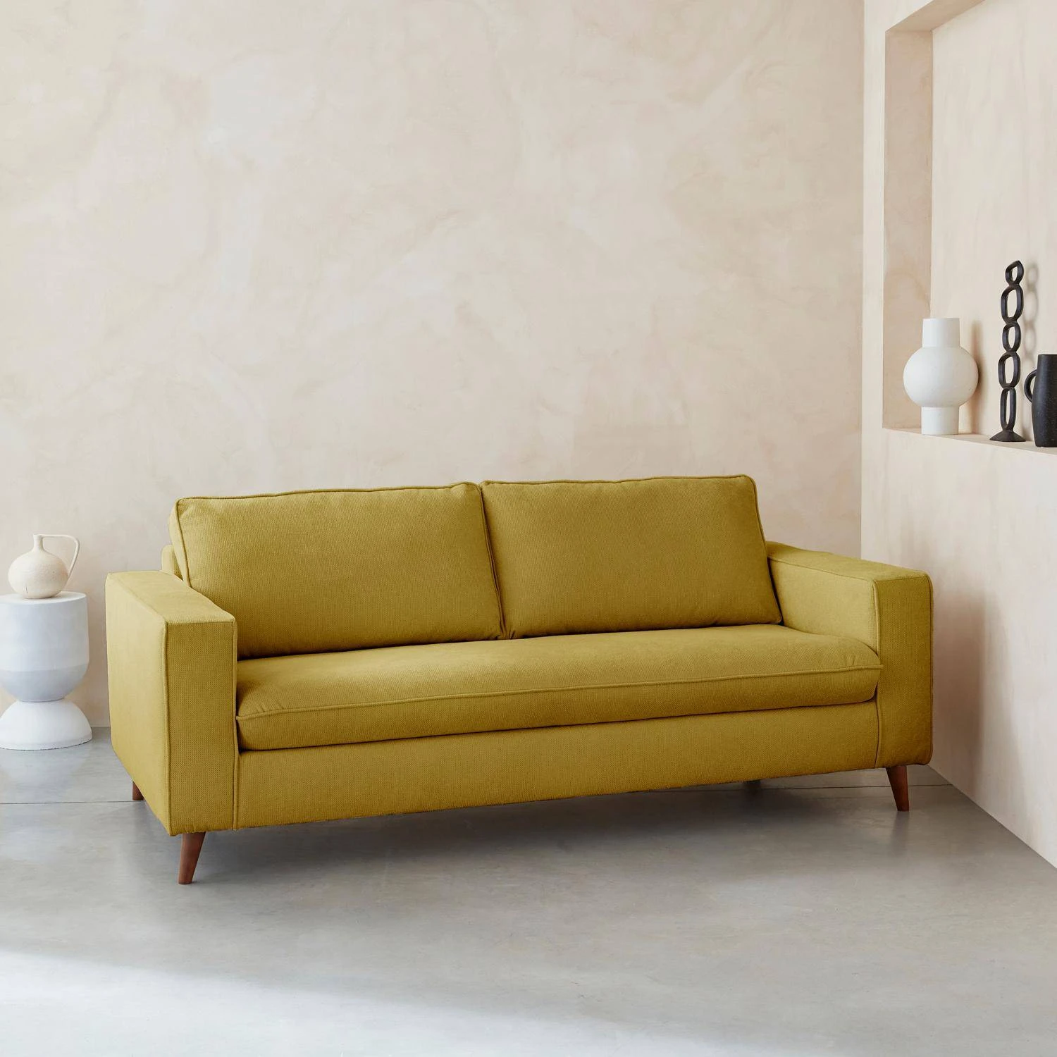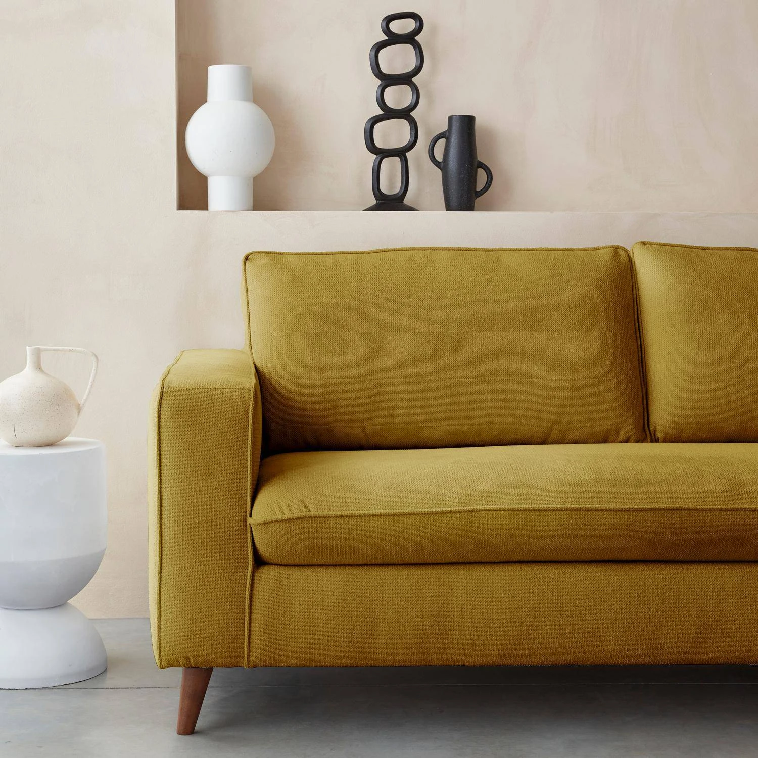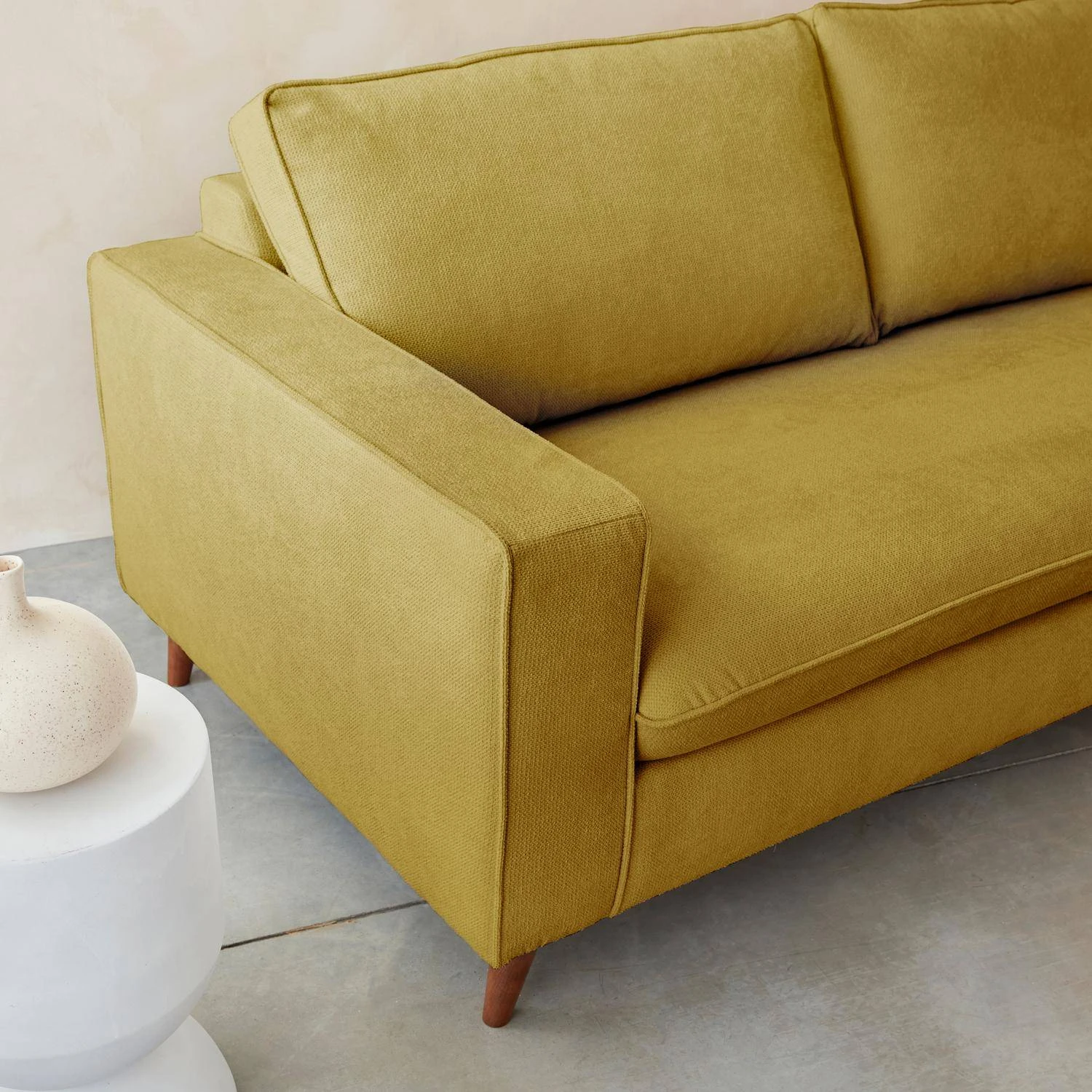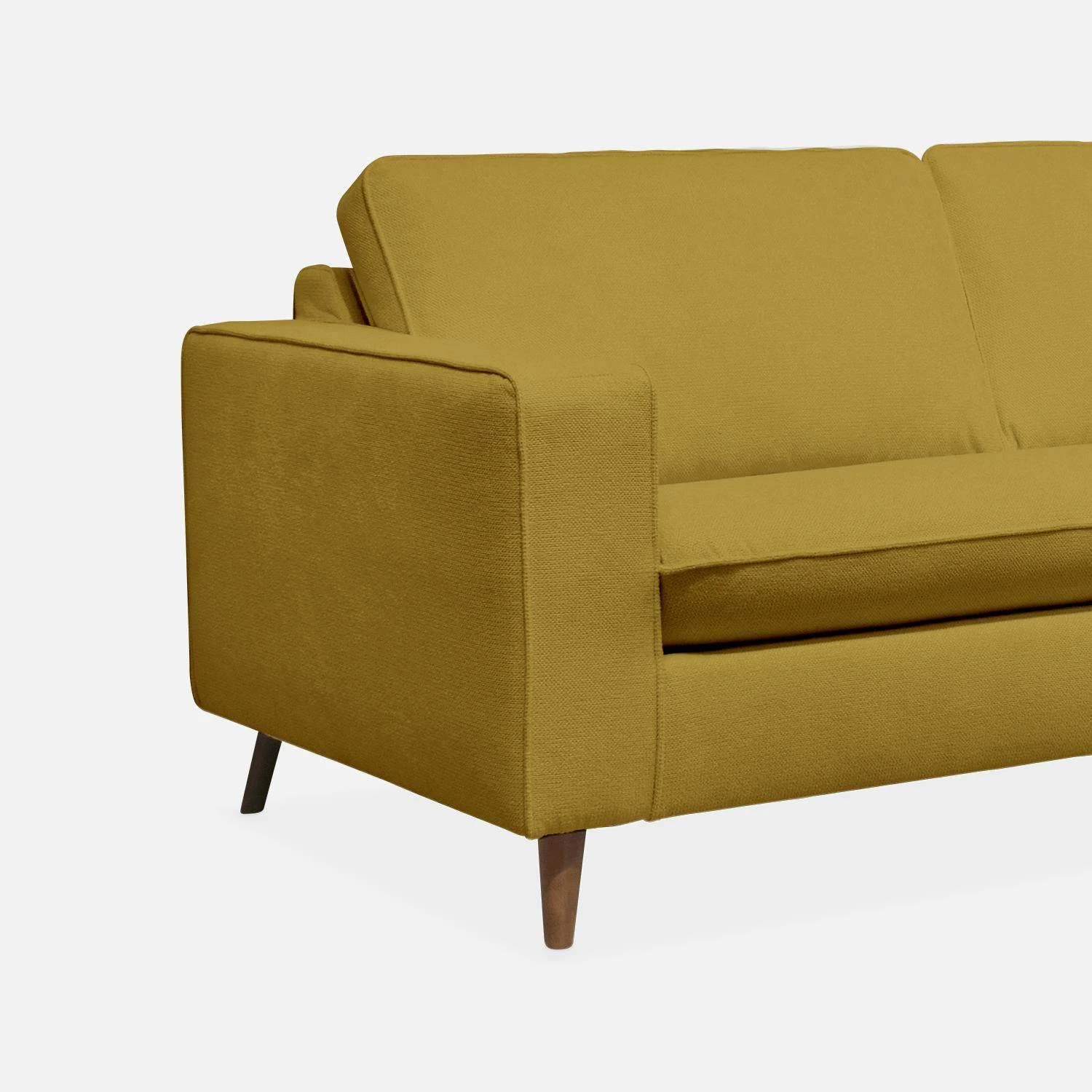 Pour une finition parfaite, les pieds du canapé sont en pin et hêtre massif (origine Pologne) recouverts d’un vernis acrylique finition noyer.