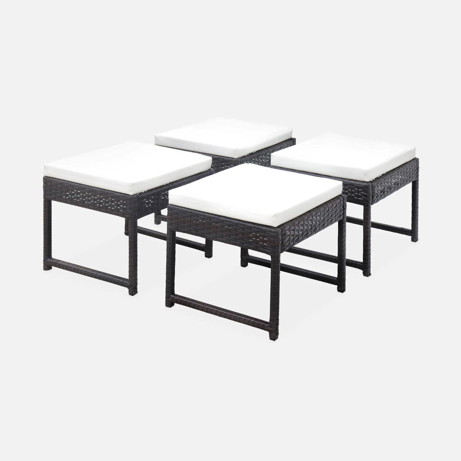 Quoi de mieux que 4 poufs pour compléter l’assise de votre table lors de vos repas en extérieur ? Ces poufs légers sont confortables et pratiques. Leur jolie structure en acier galvanisé vous permet de les déplacer facilement et leur matière est à la fois robuste et peu corrosive. Leurs petits cousins déhoussables et déperlants ainsi que leurs pieds ajustables leur apportent tout le confort dont vous vous aurez besoins pour être à l’aise ! Leur petite taille vous permet également de pouvoir les encastrer sous les chaises de la table afin d’optimiser au maximum votre espace. Pour un rendu plus design et esthétique, une résine plate tressée recouvre également la structure des poufs !