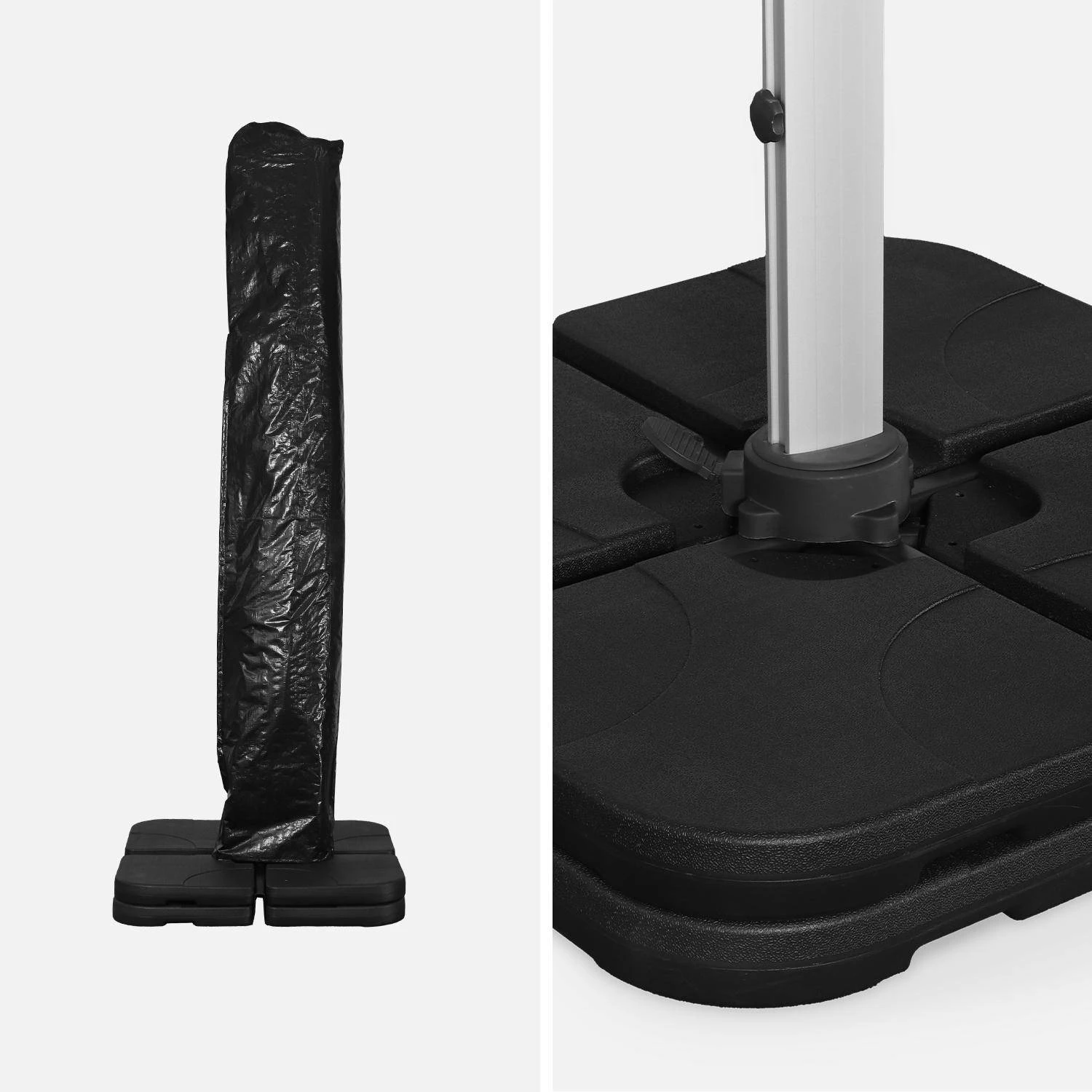 Il est indispensable de lester votre parasol (au moins 80kg). Des dalles de parasol et une housse de protection compatible sont disponibles dans notre catalogue. Vous trouverez également des lests spéciaux en béton (40x40cm à 50x50cm) dans les grandes surfaces de bricolage.