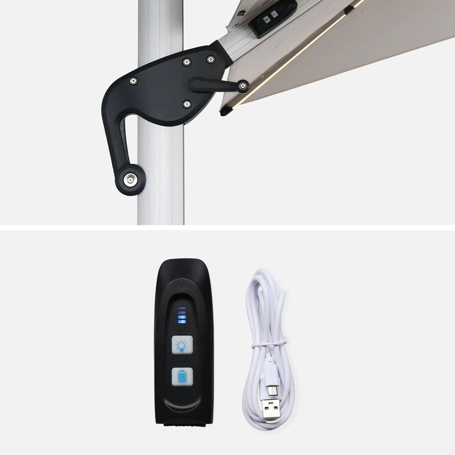 Grâce à ses bandes Led situées sur les baleines vous pourrez profiter de votre terrasse ou de votre jardin même à la nuit tombée. Lorsqu’il est éclairé, le parasol crée une atmosphère unique et chaleureuse. ll vous éclairera pendant 4 heures grâce aux led situées sur les baleines. La batterie se charge automatiquement grâce au chargeur solaire ou grâce à un chargeur micro USB.