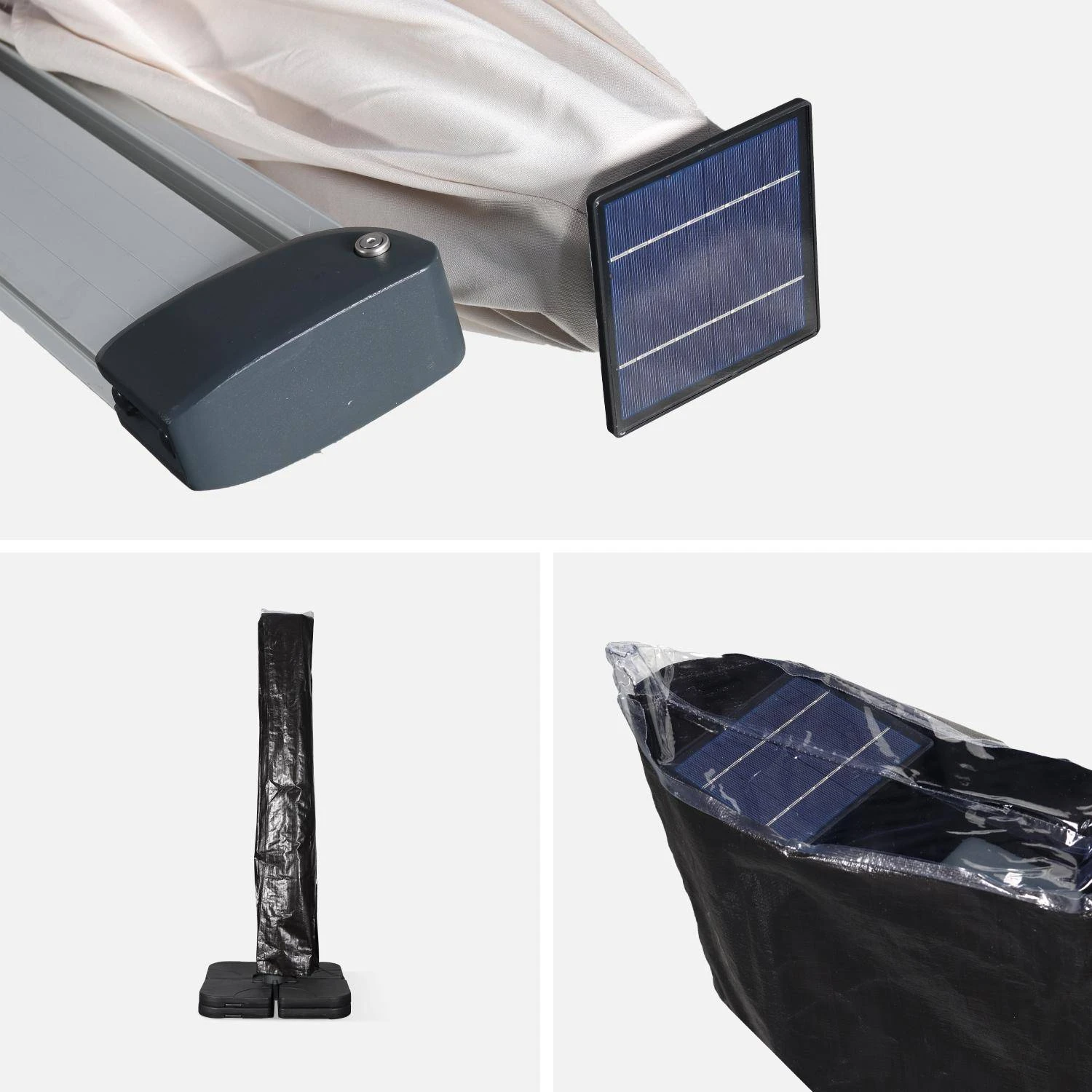 Son ouverture et sa fermeture s’effectuent simplement par manivelle. Le parasol déporté est livré avec une housse de protection en polyéthylène pour le protéger lorsque vous ne l’utilisez pas.
