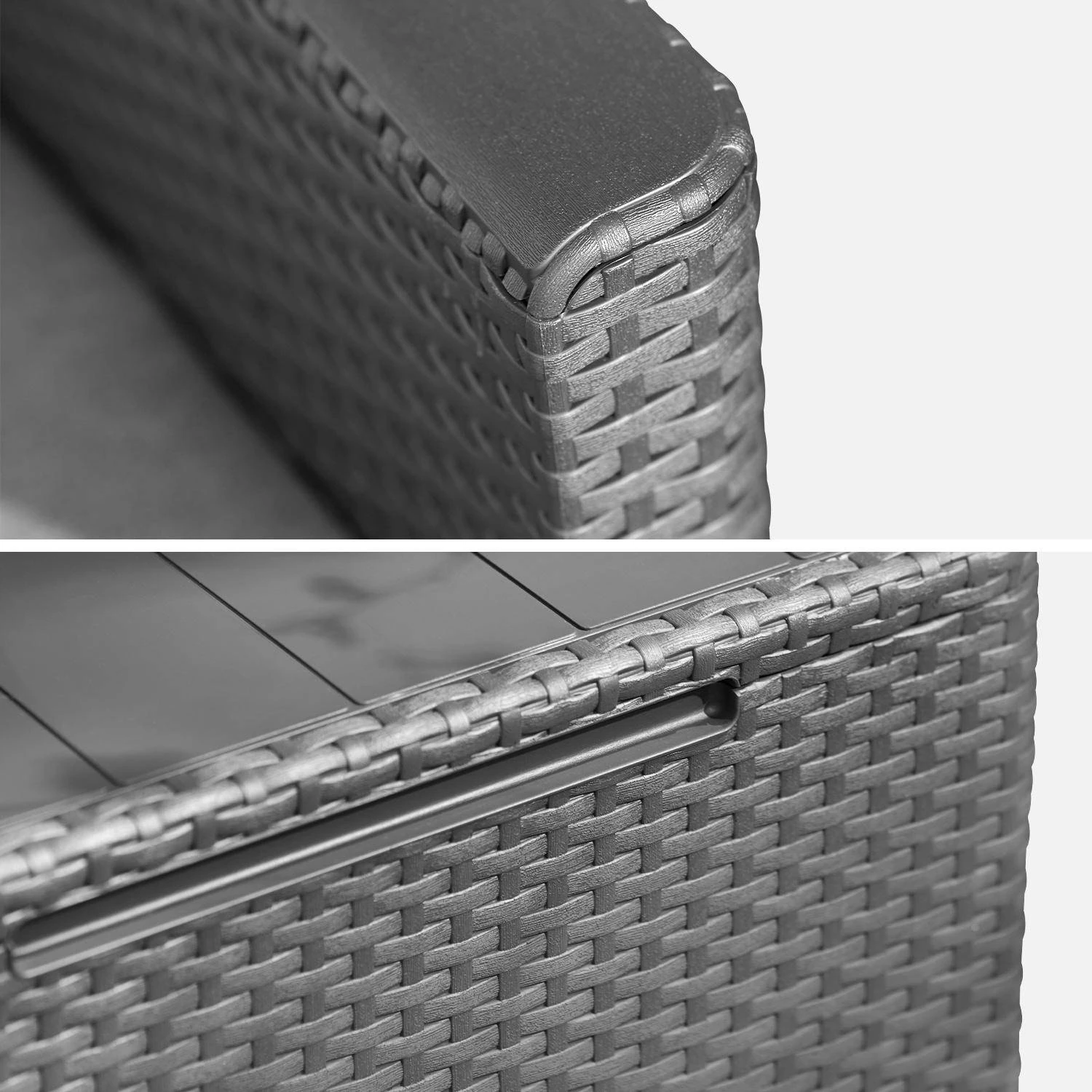 Les assises de ce salon permettront d’accueillir 4 convives, idéal pour un apéro entre amis. Aucune matière sensible, il sera donc très facile de l’entretenir. Sa couleur graphite est tendance et s’accomodera à tous les styles. Ces assises sont livrées avec des coussins qu’il sera aisé de ranger en temps de pluie grâce à la table basse doté d’un plateau amovible.