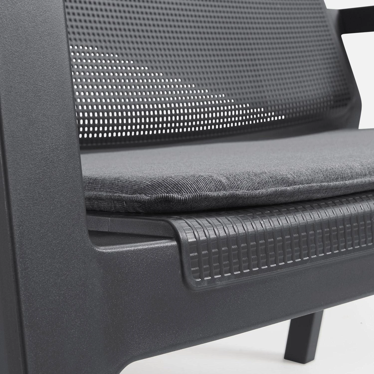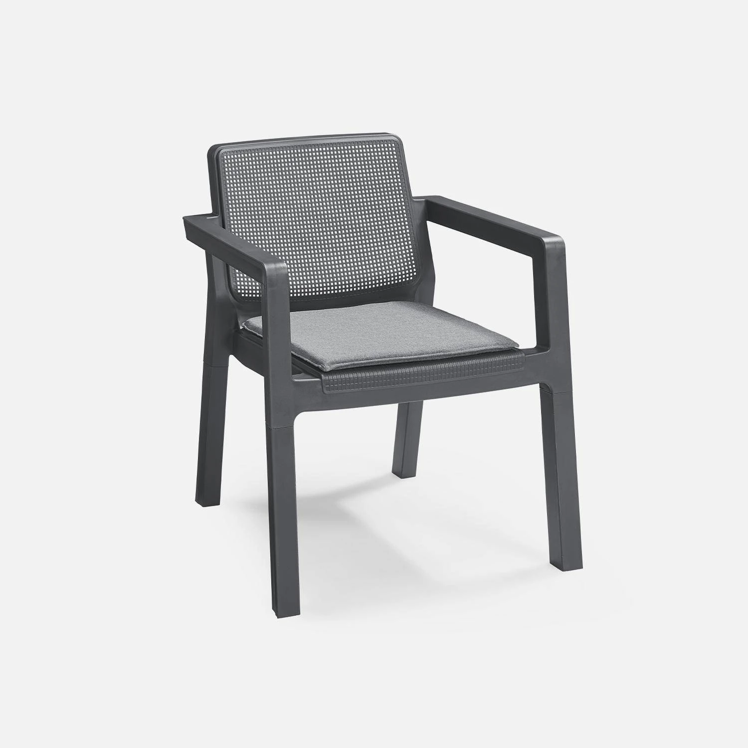 Les assises de ce salon permettront d’accueillir 4 convives, idéal pour un apéro entre amis. Aucune matière sensible, il sera donc très facile de l’entretenir. Sa couleur graphite est tendance et s’accomodera à tous les styles. Enfin, afin de gagner de la place, les fauteuils sont empilables.