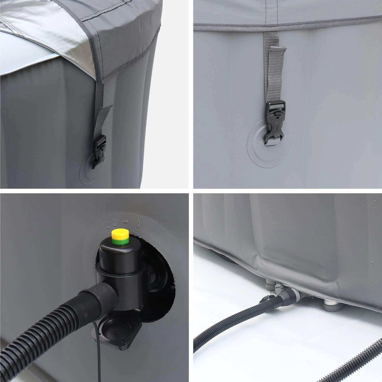 Ce spa est simple d’utilisation. La température, la mise en marche, la chauffe différée et les autres fonctionnalités se gèrent grâce à la télécommande filaire étanche. Le gonflage s’effectue par système intégré. Il suffit de brancher le spa, d’enclencher le mode gonflage et de presser une touche de la télécommande, rien de plus simple ! La mise en place est facile et ne nécessite pas d’outil. En 10 minutes, le spa est installé et prêt à accueillir de l’eau. Un système de vidange avec adaptateur pour tuyau d’arrosage permettra de vider votre spa proprement et sans effort.