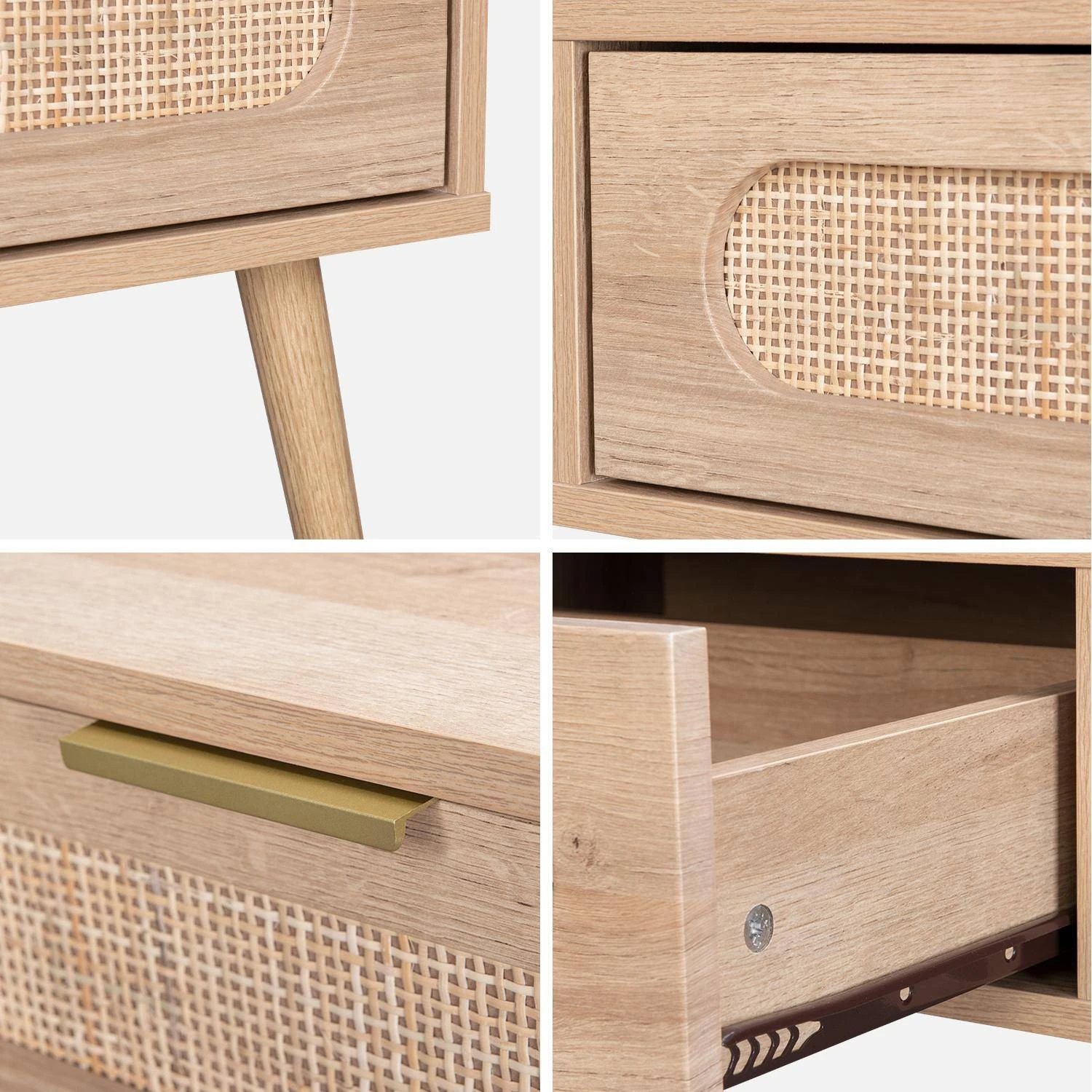 La table basse Eva est le meuble parfait à placer au cœur de votre salon. Son design léger et naturel s’intégrera parfaitement au reste de la décoration. Son décor bois et son cannage arrondis, pour un côté plus design, ne manqueront pas d’ajouter charme et élégance à votre intérieur ! Ses poignées dorées et ses pieds compas d’inspiration scandinave quant à eux apportent une touche de caractère qui vient rehausser l’ensemble !