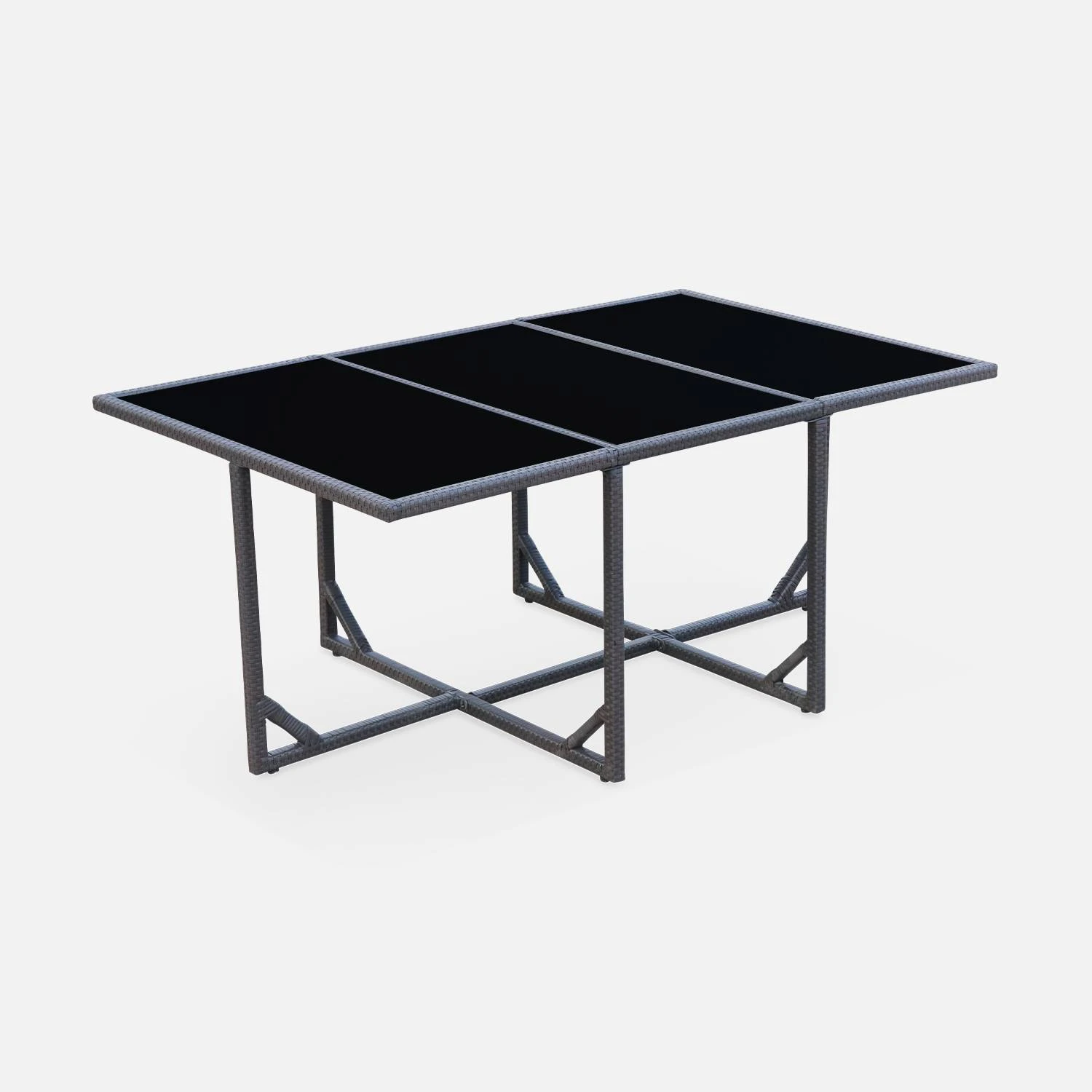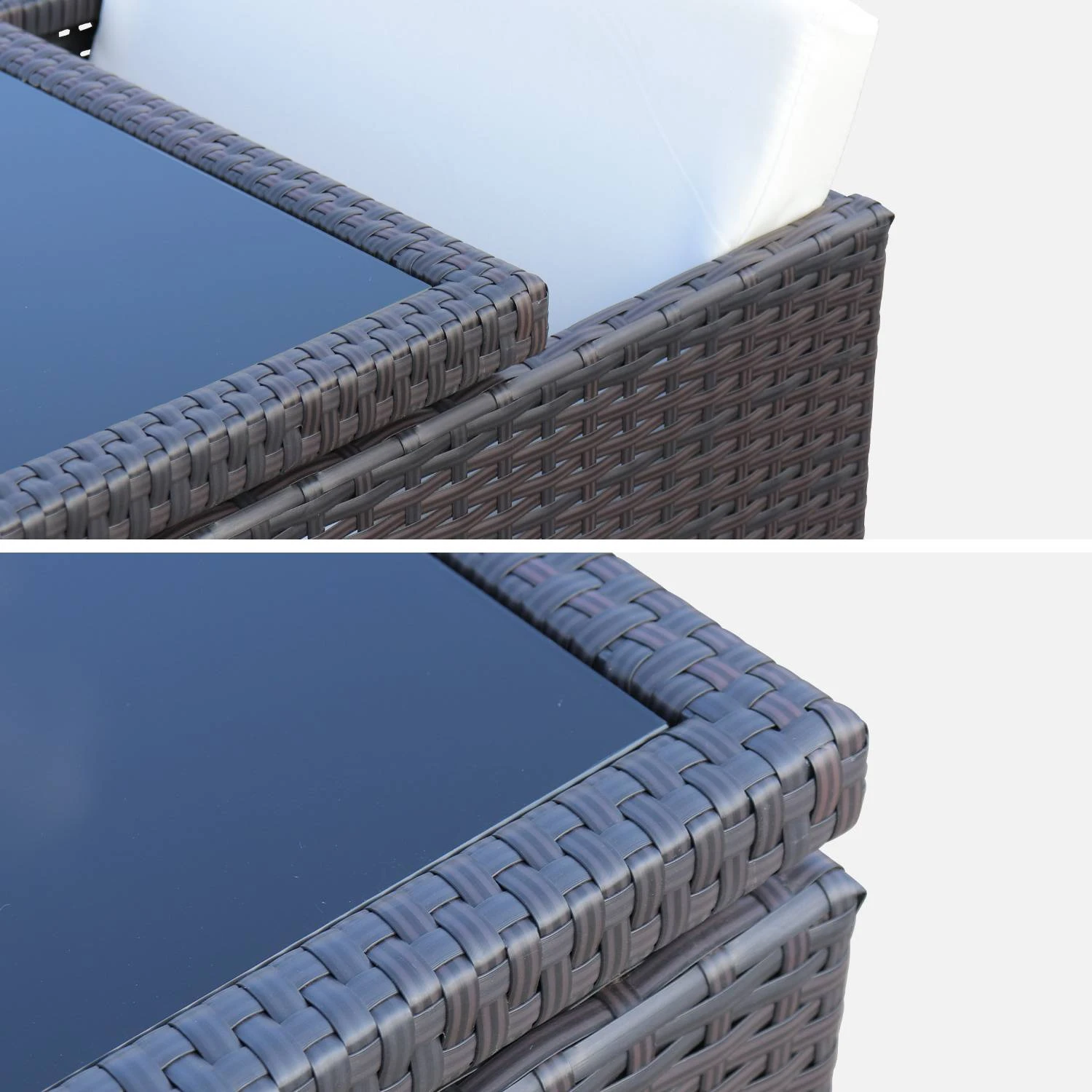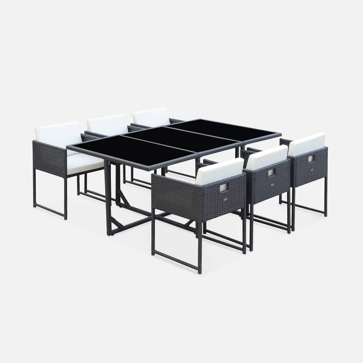 Voici un salon de jardin en résine marron pour 6 personnes. Ce salon prend très peu de place lorsqu’il n’est pas utilisé car il est encastrable, et vous pouvez même y laisser les coussins lors du beau temps. La structure en acier galvanisé permet d’obtenir un salon de jardin léger, facile à bouger, notamment les chaises qui sont en plus dotées de poignées. De plus, cette matière est robuste et non corrosive. Dans une question d’esthétique, la structure est également recouverte de résine plate. Les trois verres trempés, de 5mm d’épaisseur, apportent une finition élégante à la table.