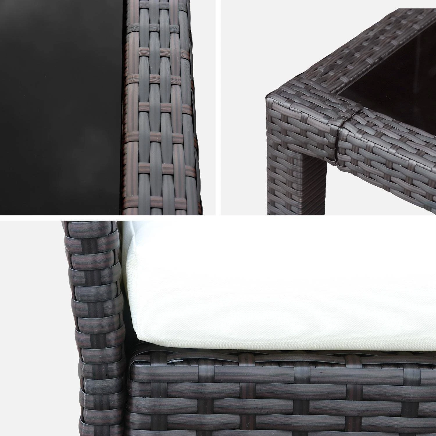 Les coussins sont résistants à l’eau et déhoussables. La table est composée de 3 plateaux en verre trempé noir de 5mm d’épaisseur. C’est un verre 5 fois plus solide que le verre traditionnel.