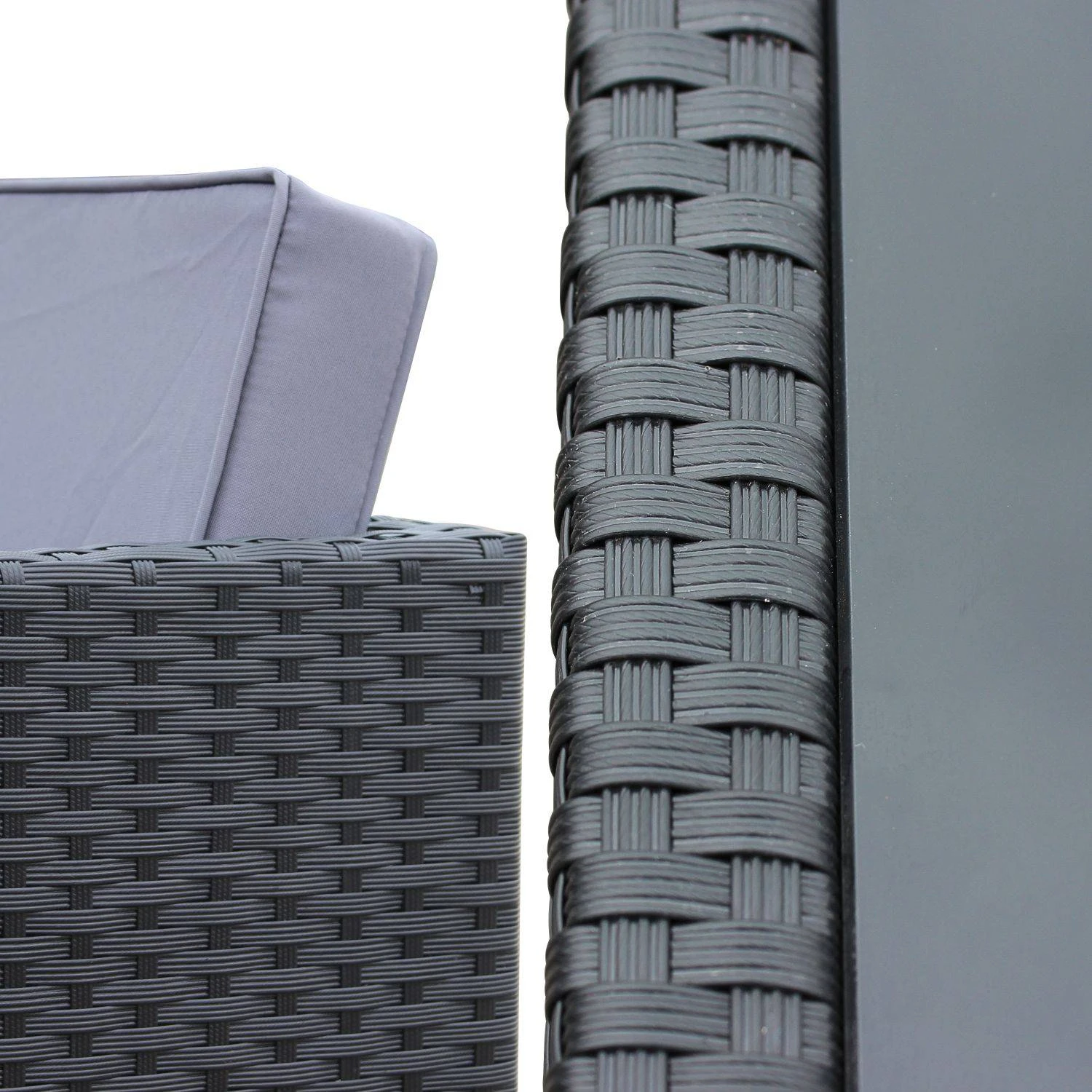 Conçu en résine tressée, le Vasto est très solide. En effet, ce matériau chic et moderne est pensé pour résister aux UV et aux intempéries (pluie, neige, eaux salées). Pour vous garantir longévité, la structure métallique de cet ensemble de jardin est en acier galvanisé recouvert d’une peinture thermolaquée. Ce traitement offre une plus grande protection contre l’oxydation de l’acier. Les coussins sont déhoussables et résistants à l’eau. De plus, ils sont munis d’un passe-poil ! Le plateau de la table est en verre trempé noir, 5mm d’épaisseur. C’est un verre 5 fois plus solide que le verre traditionnel.